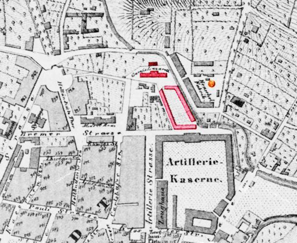 Rot: das Garnisonslazarett (ab ca. 1831),