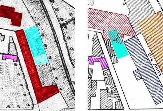1822 kann ein Nachbargebäude am linken Bildrand dienen (violett markiert).