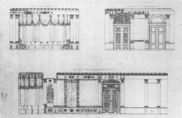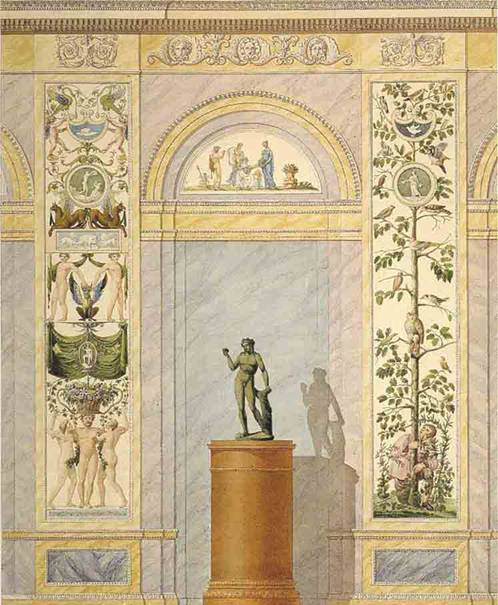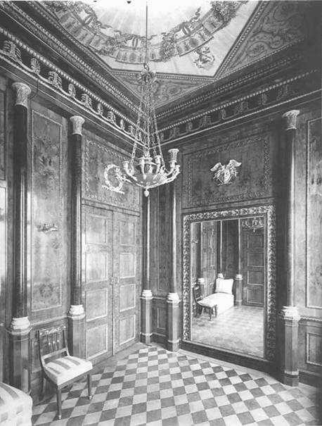 Spiegeln besetzt. Die Lünetten waren mit antikisierenden Szenen. Über der Tür