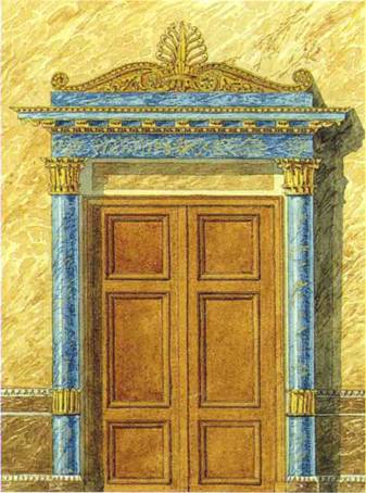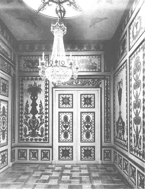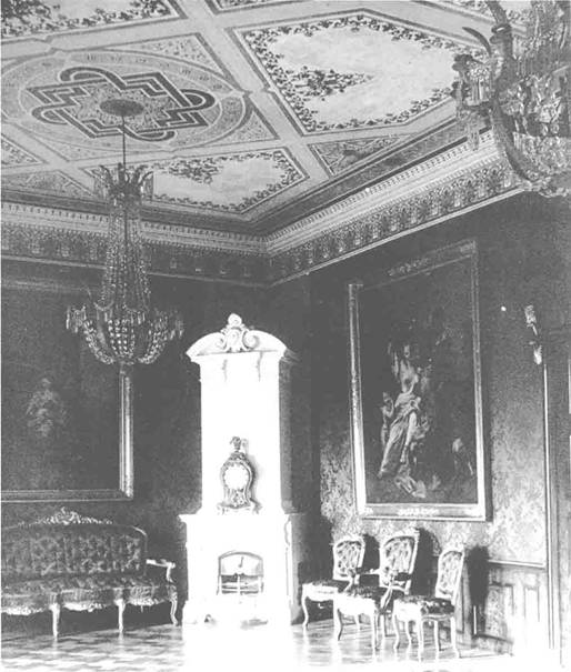 Konsolen der Türverdachungen waren vergoldet. Hinter den Öfen gelber