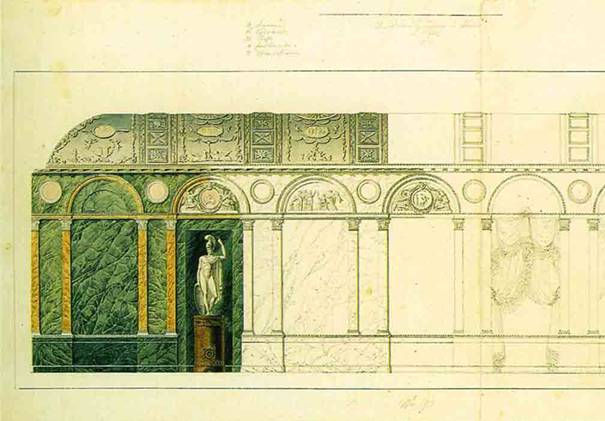 wurde die Nische geschlossen, Fries und Decke neu bemalt, die Öfen entfernt und