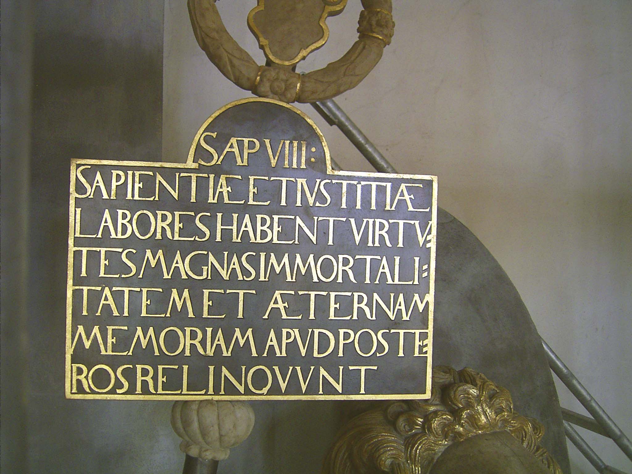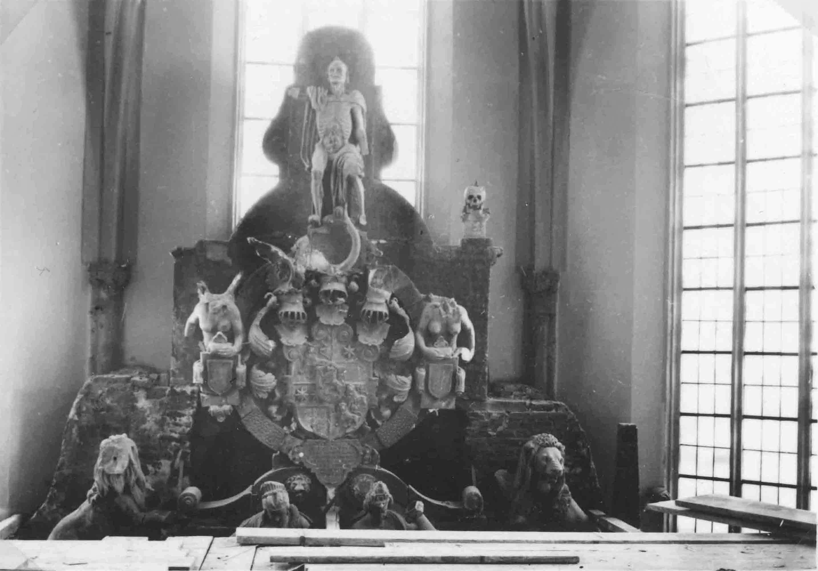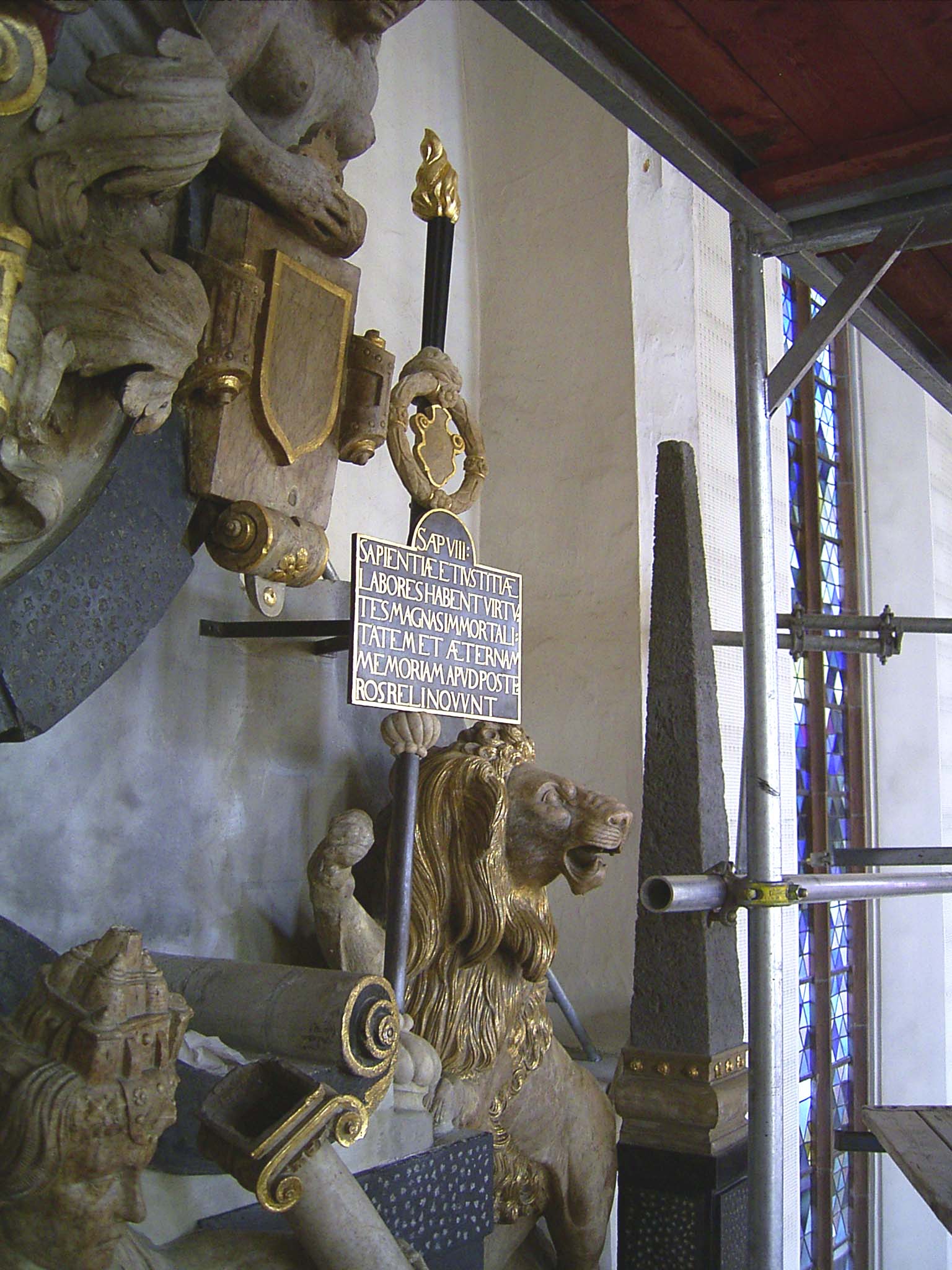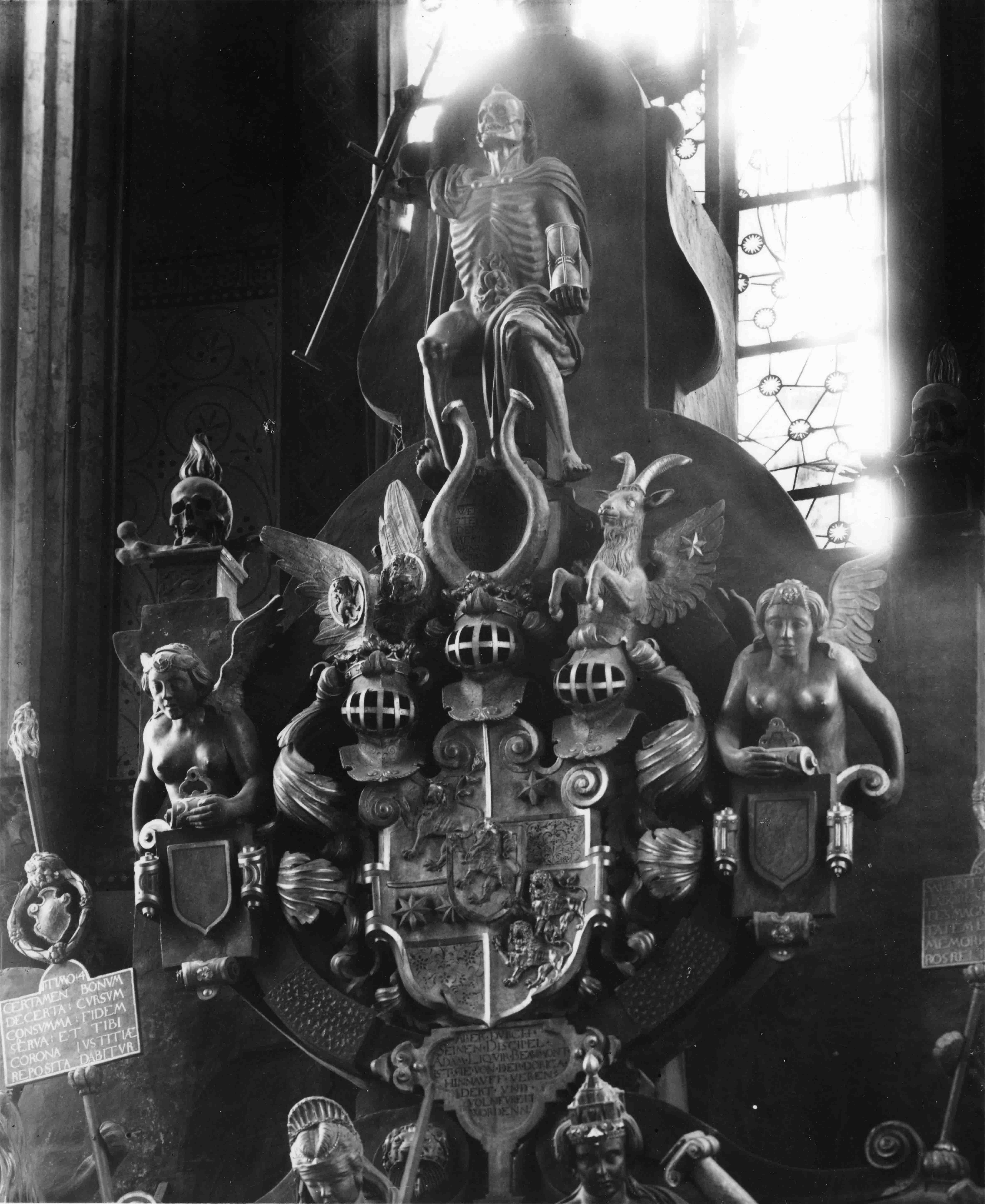 die heute fehlenden Teile des Rankenwerks (Helmdecke) in der großen Wappenkartusche noch vorhanden waren; sie sind erst