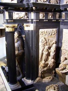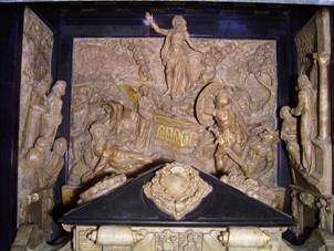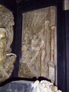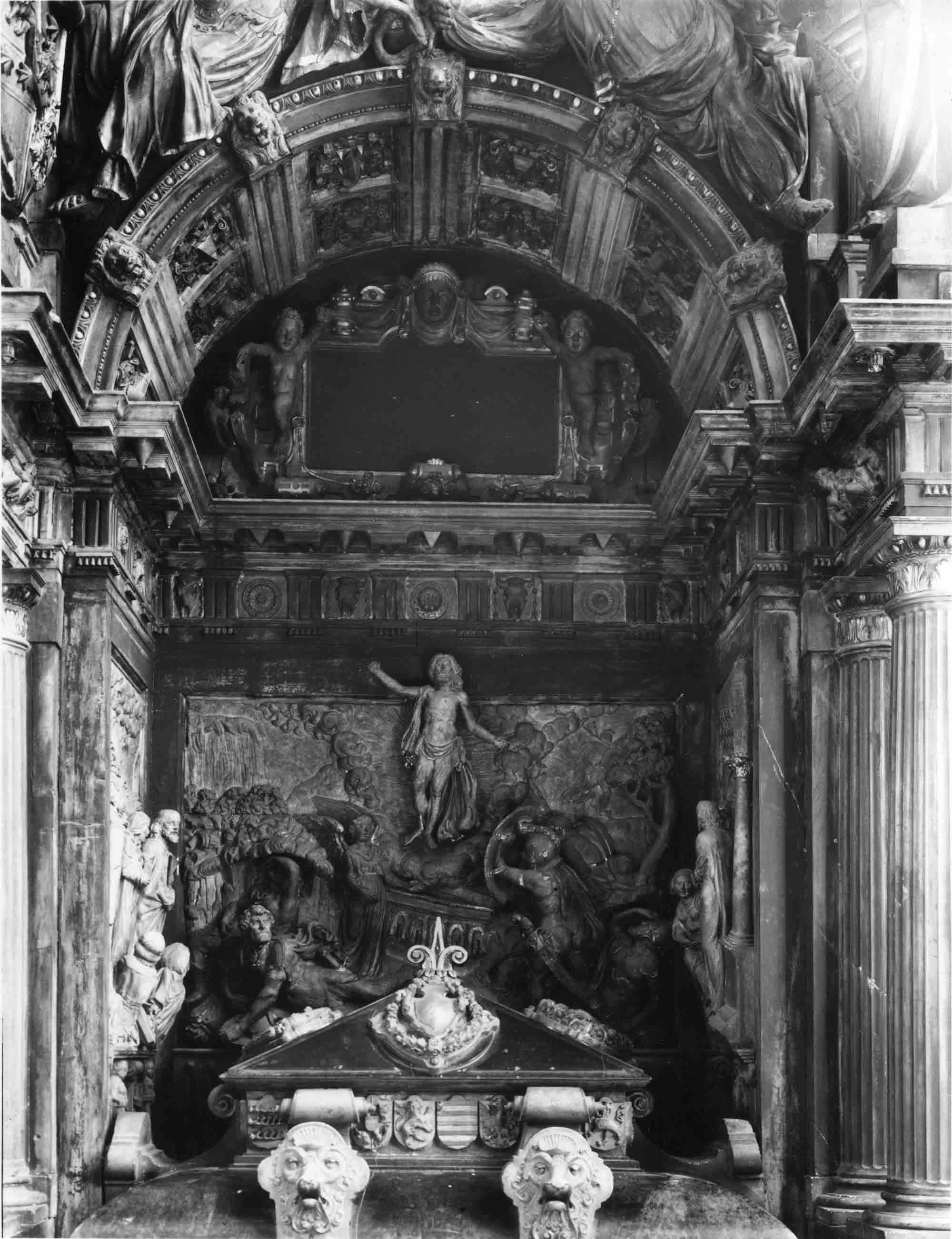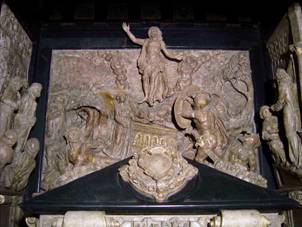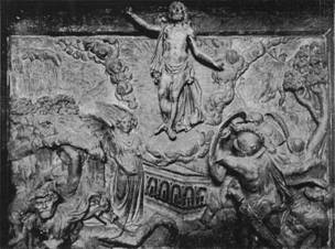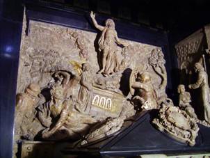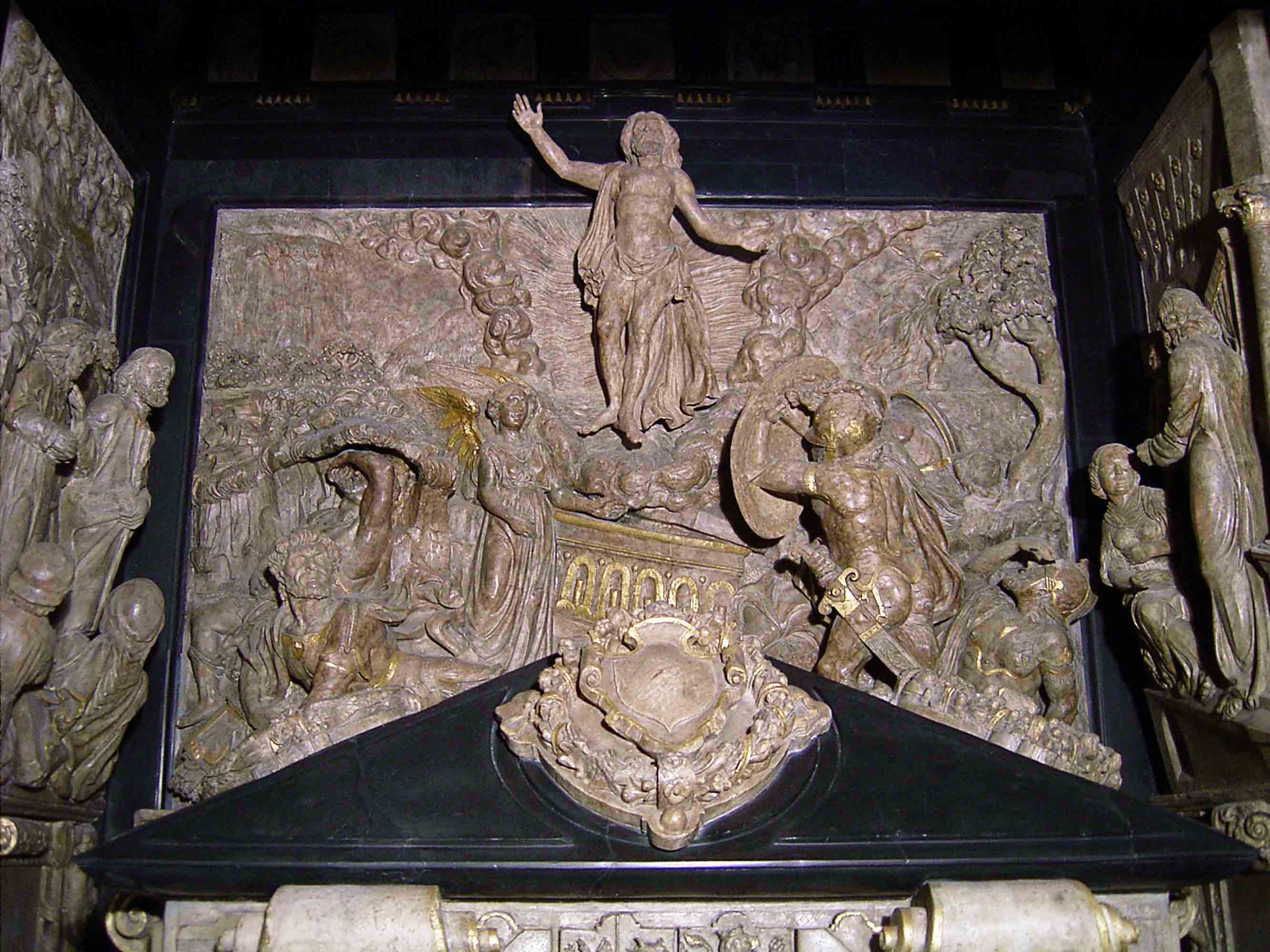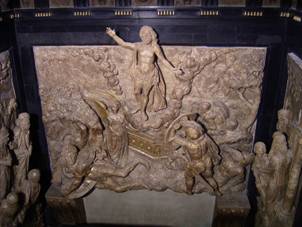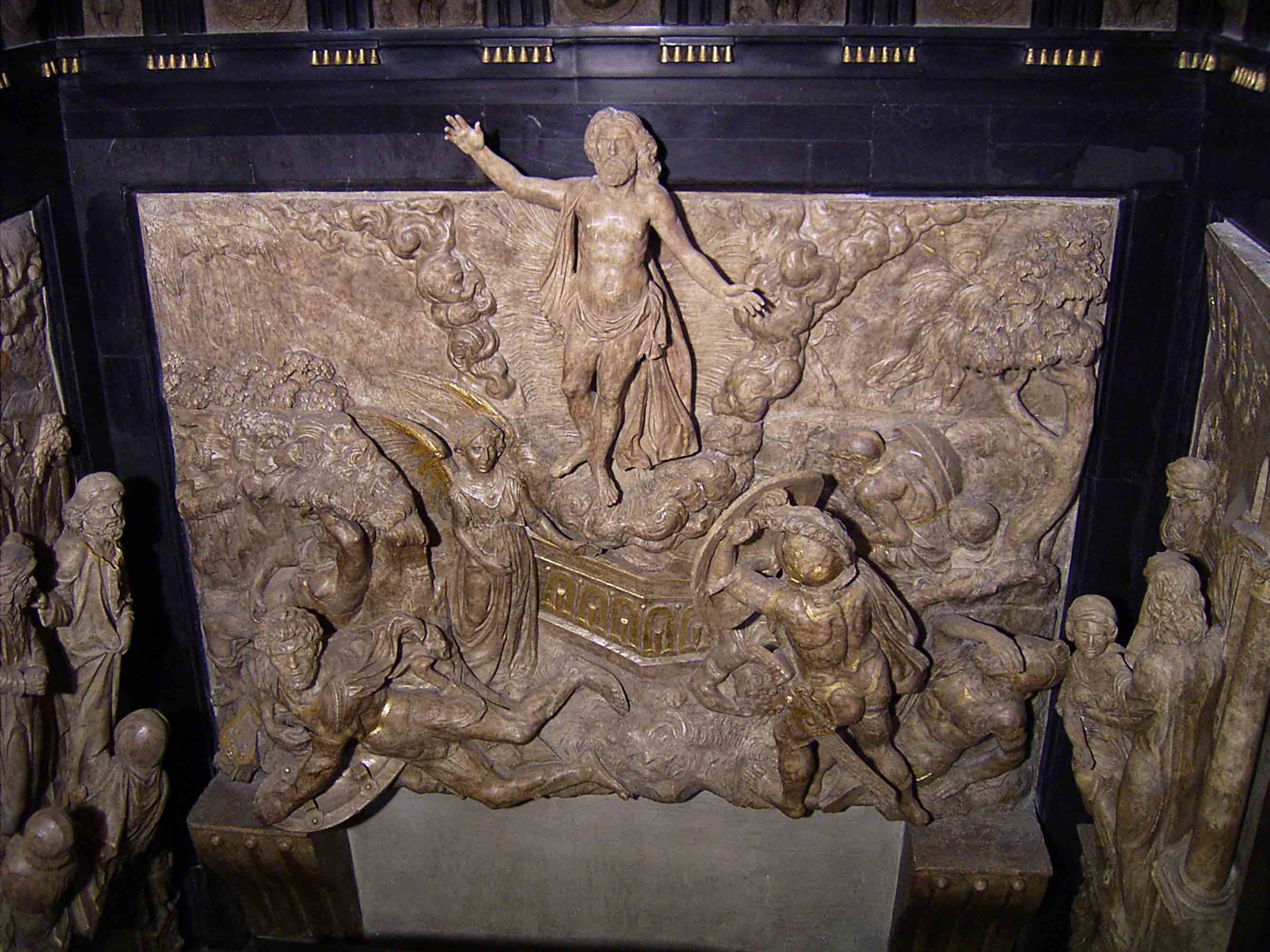 Relief der Auferstehung Christi und den seitlichen Reliefs auch der Sarkophag